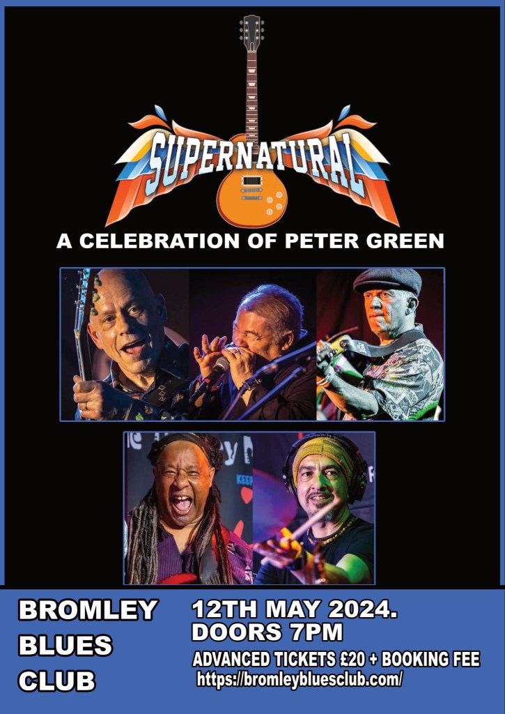 Supernatural is celebration of the peerless Peter Green, drawing mainly on his glorious heyday with John Mayall’s Bluesbreakers, and the band he founded – the original Fleetwood Mac, “The Supernatural” conveys the poignancy of Peter’s playing and writing, from “The Stumble” to “Man Of The World”. It includes personal anecdotes from players who knew him, original songs inspired by him, and embraces the early Mac’s sense of fun. Conceived by ‘Timeless Tim’ Hain, a lifetime Green lover, the line-up includes fellow devotees Alan Glen (Yardbirds, Nine Below Zero ) the ever-Green, hugely entertaining Robin Bibi ; Tansay Omar, and Osibisa’s current frontman Gregg Kofi Brown, who played with Peter in the early days of Kolors.